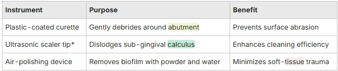 Dental professionals employ instruments designed to avoid scratching implant surfaces while removing deposits: